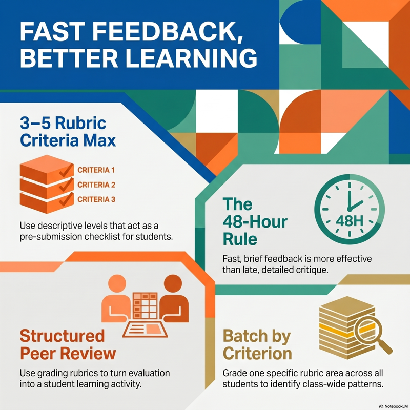 The instructors who maintain high-quality feedback without burning out aren't working harder — they've built a system. Rubrics aligned to objectives. Staggered deadlines. Peer review for formative work. Brief recorded walkthroughs for common issues. Every piece of the system reduces the per-student grading cost while keeping feedback meaningful.